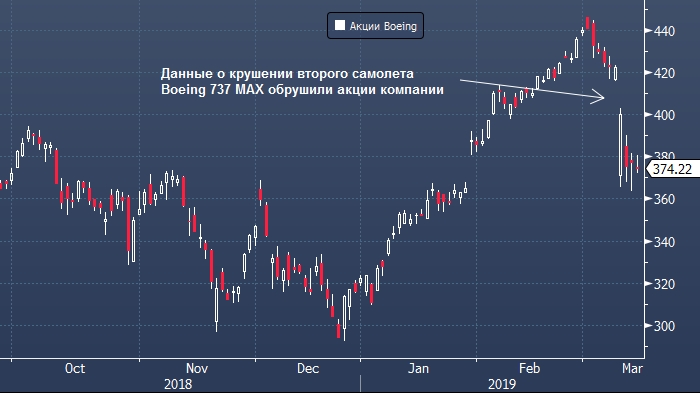 С конца февраля акции Boeing подорожали на 50% с лишним, но новость о втором за последние несколько месяцев крушении 737 MAX (ProFinance.ru: первое произошло 29 октября в Индонезии) спровоцировала резкое снижение котировок.