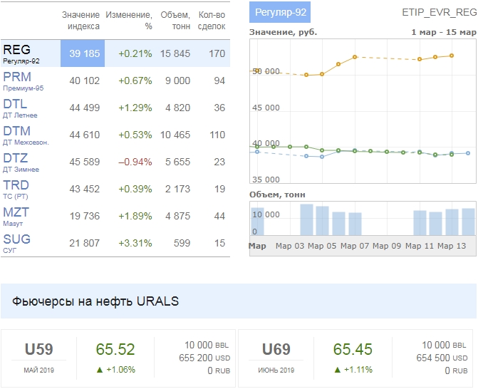 На Санкт-Петербургской международной товарно-сырьевой бирже в четверг 14 марта бензин марки Регуляр-92 вырос в цене на 0.21% до 29.19 руб. за литр. При этом Премиум-95 подорожал на 0.67% до 30.28 руб. за литр. Майские и июньские фьючерсы на нефть марки Urals прибавили в цене более 1%, поднявшись до $65.52 и $65.45 за баррель соответственно. Дневной объем на рынке нефтепродуктов составил 88 891 тонны или 3.52 млрд рублей.