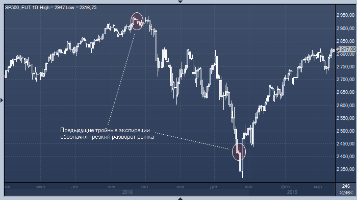 «Последние три тройных экспирации обозначили разворот рынка», - напоминают эксперты банка. - «За экспирацией 21 сентября последовал трехмесячный обвал, а после экспирации 21 декабря — резкий разворот вверх».