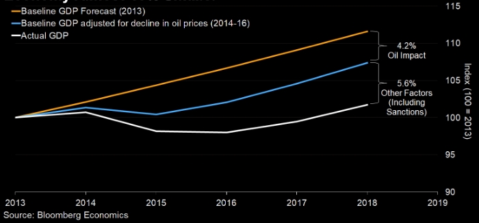 Согласно опубликованному в конце прошлого года аналитическому докладу лондонского экономиста Bloomberg Скота Джонсона, экономика России сократилась на 10% или $150 млрд по сравнению с тем, что было в конце 2013 г. Из-за снижения цен на нефть ВВП сократился на 4%, но остальное связано с санкциями и некоторыми другими факторами.