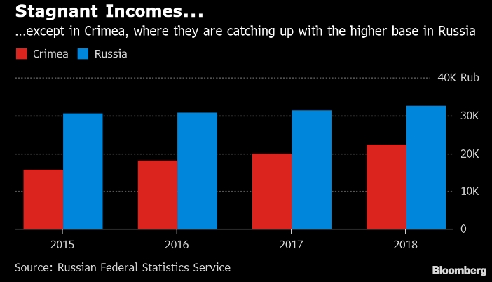 Экономическое затишье означает, что все меньше денег просачивается в зарплаты обычных граждан, утверждают экономисты Bloomberg Economics. С момента присоединения Крыма средний доход едва превысил 30 тыс. рублей ($459). При этом в самом Крыму зарплаты выросли, поскольку регион сравнялся со средней статистической базой по всей стране.