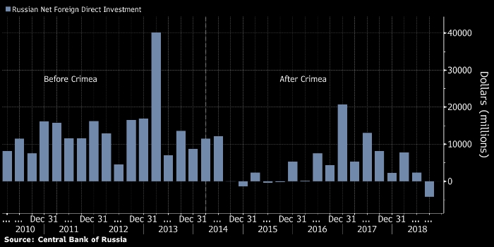 D 2017 году возникла надежда на то, что президент США Дональд Трамп снимет санкции с России. Тогда прямые портфельные инвестиции в Россию выросли, но затем показатель планомерно падал и во 2 квартале 2018 года перешел в отрицательную зону.