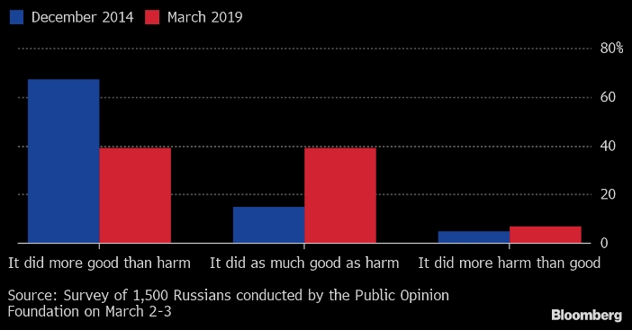 Поскольку экономическое давление сказывается на благополучии обычных граждан, общественное мнение по поводу Крыма стал не таким позитивным как ранее, утверждают в Bloomberg Economics. Они приводят в пример результаты опроса общественного мнения, который был опубликован в четверг 14 марта: только 39% россиян считают, что присоединение Крыма принесло стране больше пользе, чем вреда. В конце 2014 года придерживающихся такой точки зрения граждан было 67%.