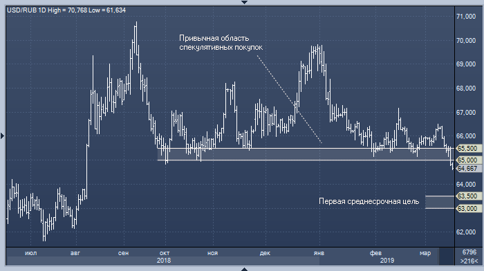 В случае роста рубля в первые часы торгов понедельника многие трейдеры, привычно покупавшие американскую валюту против российской в диапазоне 65-65.50, получат «стопы», и курс доллара к рублю будет иметь все шансы на быстрое снижение в область 64.