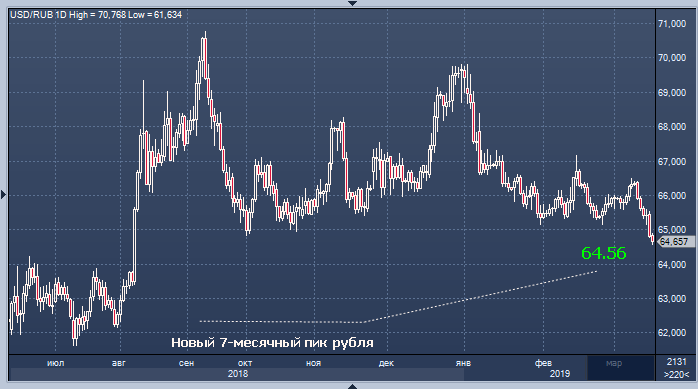 Курс рубля утром в понедельник обновил 7-месячные максимумы к доллару и евро за счет дорогой нефти, профицита текущего счета РФ в первом квартале, крупных мартовских налоговых выплат, ожиданий смягчения риторики ФРС, усиления спекулятивной активности, роста иностранного интереса к российским долговым госбумагам. Технические факторы также сыграли свою роль. Брокеры принудительно закрывают длинные валютные позиции, открытые в феврале из-за опасений новых санкций США, поскольку клиенты не могут поддержать уменьшающееся из-за укрепления рубля маржинальное обеспечение, сообщает Reuters. Рубль благодаря перечисленным факторам достиг сегодня утром уровня 64.56 за доллар и 73.22 за евро, максимальных отметок за семь месяцев.