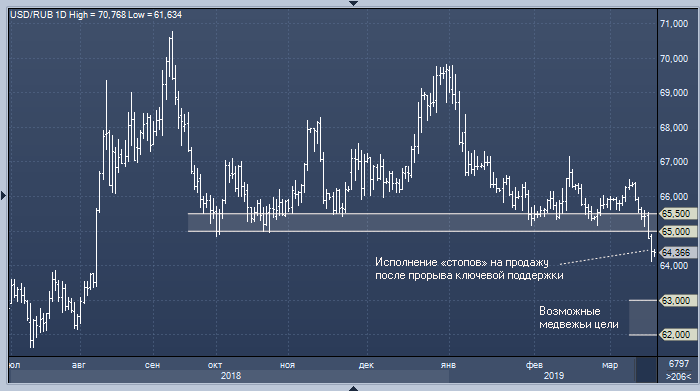 Покупать российскую валюту следует осторожно, пишет аналитик ИФК «Солид» Вадим Кравчук, не исключающий коррекционного возвращения курса доллара к рублю в область пробитой поддержки 65.