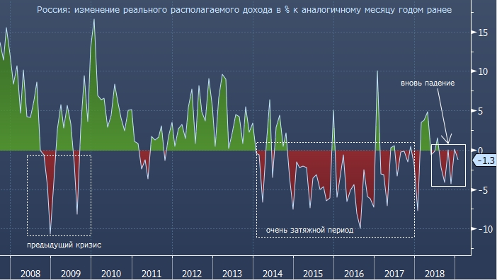 Усомниться в достоверности подсчетов многих экономистов заставил тот факт, что реальный доход населения статистически стабильно падает, но при этом розничные продажи растут. Аналитики ВТБ Капитал в своей трехстраничной исследовательской записке откровенно раскритиковали устаревшую методологию Росстата.