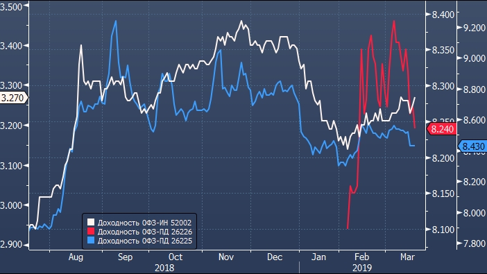 - ОФЗ-ПД 26225 с погашением 10/05/2034 на сумму в 10.5 млрд рублей при спросе в 17.4 млрд и средневзвешенной доходности в 8.47%.