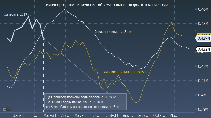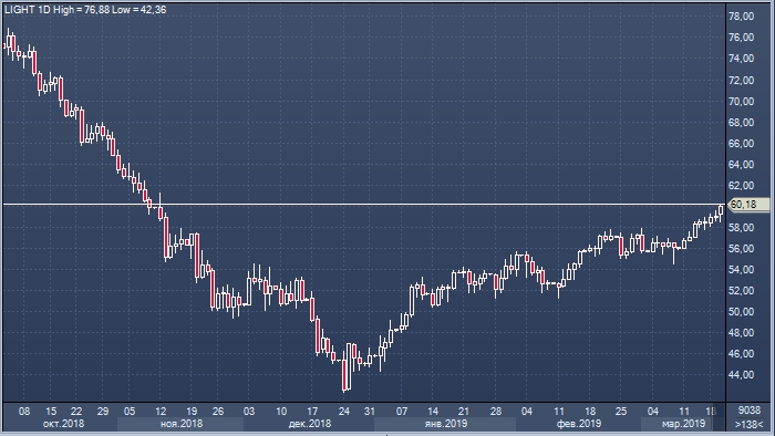 Апрельские фьючерсы на нефть WTI на торгах в среду выросли на 1.4% до $59.85 за баррель, однако этот контракт торгуется сейчас на низких объемах по причине экспирации сегодня вечером. Наиболее информативным уже является майский фьючерс, который 20 марта подорожал до $60.18 за баррель — нового максимума с 12 ноября 2018 года (4 месяца и одна неделя).