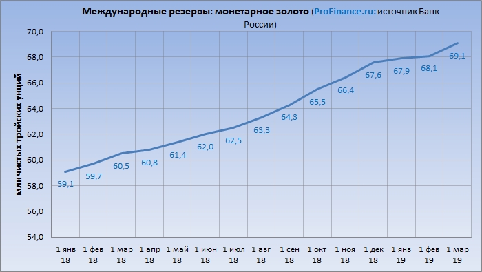 Объем монетарного золота в международных резервах по состоянию на 1 марта 2019 г. составил 69.1 млн чистых тройских унций, свидетельствует статистика, опубликованная в среду 20 марта на сайте Банка России.