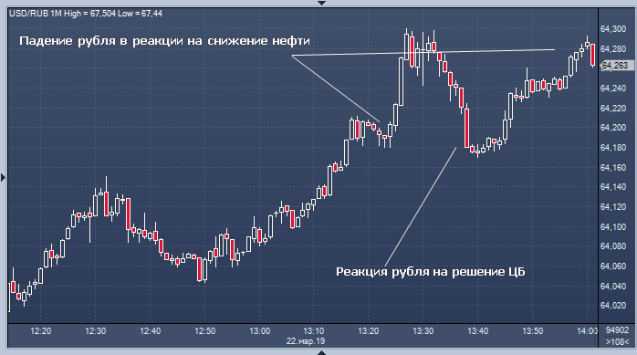 Рубль прибавил порядка 10 копеек в реакции на полностью ожидаемое решение Банка России не изменять параметры ДКП. Высокая доходность — залог роста рубля. При этом до оглашения решения курс рубля значительно ослаб по отношению к сильно окрепшему против евро доллару. Курс евро к доллару упал почти на 100 пунктов в реакции на шокирующее ухудшение деловых настроений в немецкой промышленности, согласно данным компании Маркит, которая рассчитывает индексы деловых настроений PMI. Падение евро к доллару привело к роту индекса доллара на 0.34% до 96.64. Повсеместный рост доллара спровоцировал падение нефти. Удешевление нефти и снижение евро привело к падению рубля на 65 копеек против доллара. В 15:00 мск стартует пресс-конференция Эльвиры Набиуллиной, где она, как ожидается, даст рынкам «голубиный» сигнал. На этом сигнале падение рубля может продолжится. Его падение может продолжаться до 64.30, а в случае прорыва — до 65.00.
