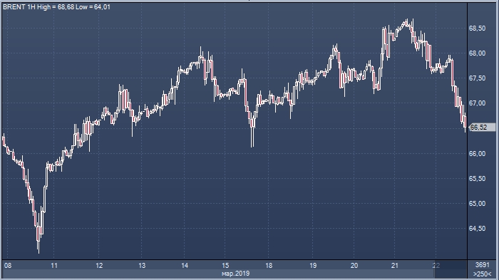 Котировки Brent в пятницу 22 марта активно снижаются: падение с начала дня составляет 2% до $66.51 за баррель. Давление на черное золото оказывает укрепление доллара и опасения в отношении замедления темпов роста мировой экономики.