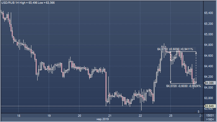 На торгах в понедельник 25 марта курс рубля по отношению к доллару укрепился на 0.93% до 64.06 за единицу американской валюты. Цены на нефть также продемонстрировали позитивную динамику, что оказало поддержку рублю. Майские фьючерсы на Brent подорожали на 0.69% до $67.49 за баррель. Стоит отметить, что в пятницу произойдет экспирация этого контракта и с апреля активным станет июньский фьючерс.