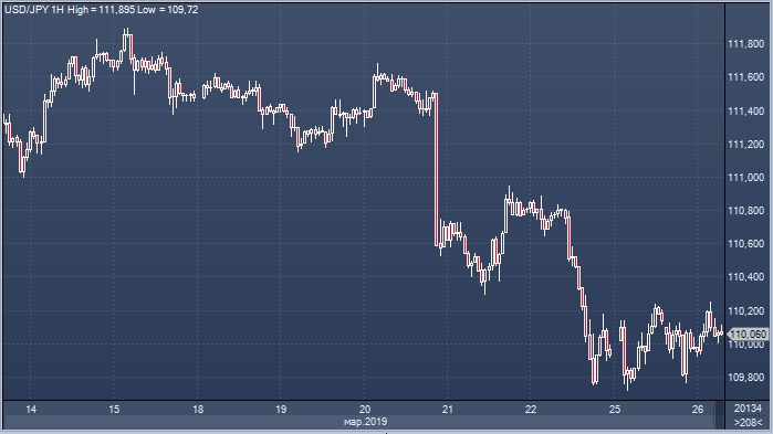 На азиатских торгах во вторник 26 марта доллар немного отодвинулся от ранее достигнутых минимумов против иены. Ранее доходности облигаций Казначейства США достигли 15-месячного дна, что оказало давление на американскую валюту. Доходность 10-летних бумаг падала в понедельник до 2.377% — самого низкого значения с декабря 2017 года. Частичное восстановление показателя доходности (до 2.417%) позволило доллару восстановить часть утраченных позиций к иене.