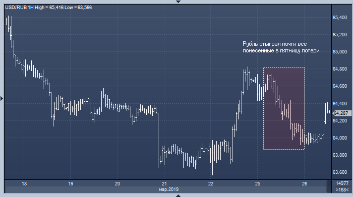 В воскресенье стало известно, что американским следователям не удалось обнаружить доказательств сговора между Дональдом Трампом и Россией в ходе выборов президента США, и на следующий день курс рубля отыграл почти все понесенные в пятницу потери, вернувшись в область 64 в паре с долларом.