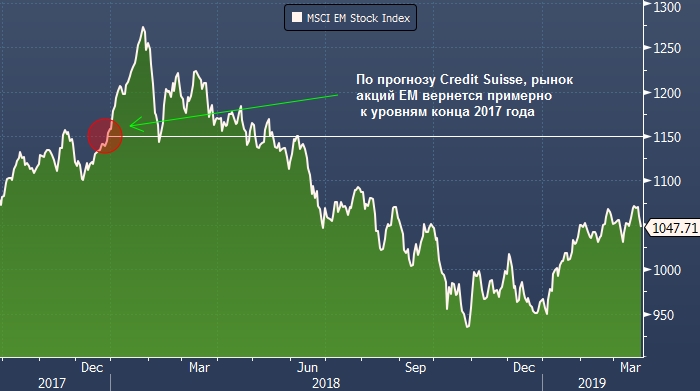К концу года фондовый индекс развивающихся стран MSCI вырастет еще на 100 пунктов с уровней закрытия понедельника (до 1150, +10%), пишут в своем новом прогнозе аналитики Credit Suisse. По результатам 2018 года индекс снизился на 17%, но теперь благодаря росту последних месяцев и сохранению этой тенденции в будущем все потери, по мнению экспертов CS, будут компенсированы.