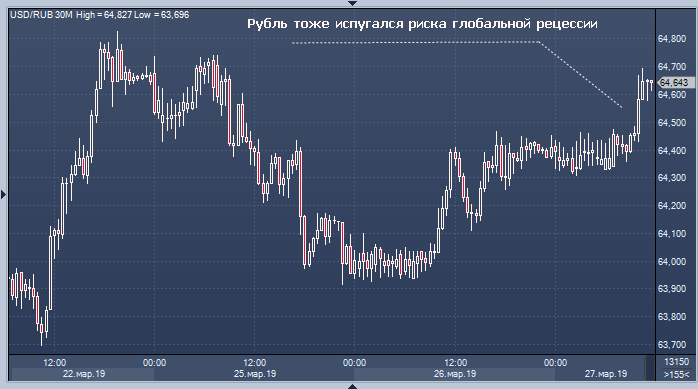 Рубль падает утром в среду, лишившись поддержки экспортеров. Его не способна поддержать даже находящаяся на локальных максимумах нефть. Настолько сильное влияние на валюту оказывает налоговый период и внешний фон. К 11:14 МСК котировки пары доллар/рубль расчетами «завтра» были вблизи 64.58, и рубль теряет более трети процента от уровней закрытия вторника. К евро рубль дешевеет на 0.3 процента, до отметки 72.79. Большинство сырьевых и развивающихся валют дешевеют на фоне бегства от риска из-за опасений замедления глобального экономического роста, в том числе на фоне негативных данных из промышленности Китая и рисков начала рецессии в США, о которых предупредила инверсия 3-месячных векселей и 10-летних бондов.
