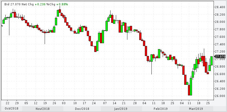 Курс гривны по отношению к доллару с минимумов 11 марта на уровне 26.00 упал до 27.04 (на 4%) на фоне приближения президентских выборов, которые состоятся в ближайшие выходные.