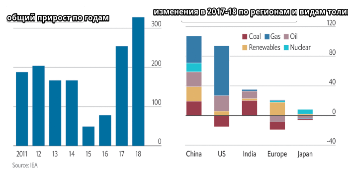 Сжигание угля составляет треть роста выбросов. Новое поколение угольных электростанций в Азии удовлетворяет почти весь дополнительный мировой спрос. Эти электростанции, как ожидается, будут функционировать еще около 40 лет. Несмотря на защиту Трампом интересов американской угольной отрасли, изобилие предложения природного газа в стране вынудило компании быстро переключиться с угля на газ. Потребление природного газа в Штатах в прошлом году увеличилось на 10%, что сопоставимо с совокупным годовым потреблением в Британии.