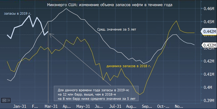 Цены на нефть попытались остаться стабильными после выхода данных по запасам от Минэнерго США, поскольку цифры практически совпали с показателями по запасам сырой нефти, опубликованными накануне Американским институтом нефти. Однако направление рынку нефти сейчас задают не только новости относительно уровня предложения (включая новости из Венесуэлы ), но и глобальная паника, которая может охватить финансовые рынки по всему миру на фоне обострившихся страхов рецессии: облигации растут, акции и прочие рисковые активы падают. Поэтому цены на нефть как высокомаржинальный финансовый инструмент сейчас также немного снижаются. С данными API можно ознакомиться по ссылке ниже.