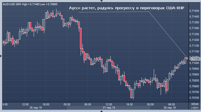 USD/JPY упал на 0.4% до 110.10, снижаясь второй день. Доходность 10-летних казначейских облигаций упала на 3 б.п. до 2.34%, самого низкого уровня с декабря 2017 года, поскольку трейдеры увеличили ставки на то, что ФРС будет снижать процентные ставки по крайней мере один раз в этом году. Облигации в Японии и Австралии также выросли, а трехлетняя доходность австралийца упала до рекордно низкого уровня. Потоки средств, связанные с концом квартала, который также совпадает с концом финансового года в Японии, способствовали ралли казначейских обязательств, сказали трейдеры. Индекс доллара падает на 0.1% до 96.87.