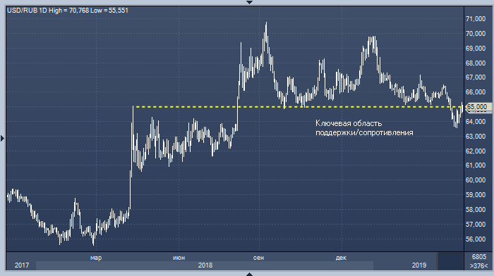 Теперь в доллар/рубле сформировалась классическая возвратная коррекционная фигура, отмечает Василий Карпухин, начальник отдела экспертов по фондовому рынку «БКС Брокер». Он обращает внимание, что пара вернулась к ключевой области бывшей поддержки 65.00-65.20, которая многие месяцы ограничивала любые попытки снижения. В середине месяца она была пробита, а вчера доллар/рубль протестировал ее уже снизу.