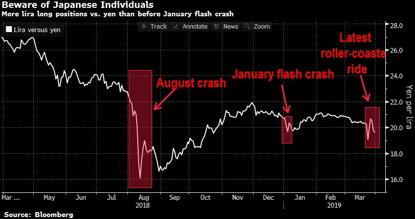 После американских горок лиры новая головная боль для Турции может исходить от игроков, находящихся на расстоянии многих миль: от японских розничных инвесторов. Длинные позиции японских маржинальных трейдеров в лире против иены составили 317 283 по состоянию на 28 марта, согласно данным Tokyo Financial Exchange Inc. Это выше, чем 288 563 контракта на 2 января, за день до так называемого «флеш-крэша» в начале года, когда внезапный рост иены отправил валюты по всему миру в штопор. Турецкая валюта упала почти на 10 процентов против японского коллеги 3 января.