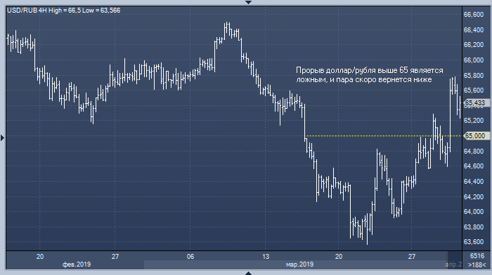 По мнению эксперта, недавний прорыв доллар/рубля выше ключевой области 65 является ложным, и вскоре пара вернется ниже.