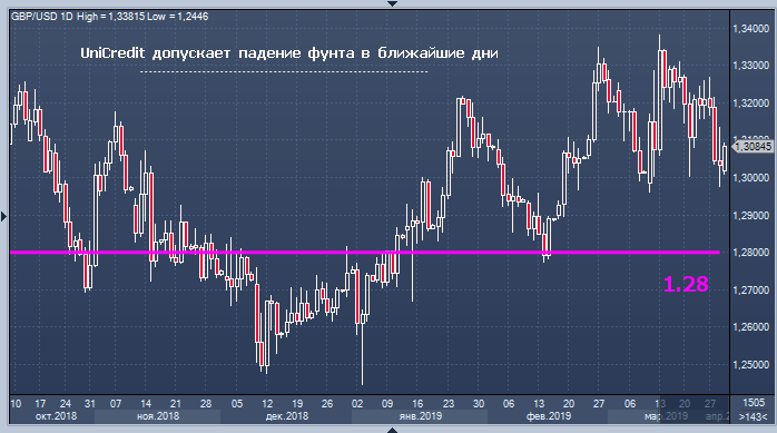 В UniCredit считают, что, если в предстоящие дни ситуация не прояснится, пара фунт/доллар может снизиться до 1.28, а пара евро/фунт — подняться до 0.88, «так как рынки будут сильнее нервничать по поводу жесткого Брексита, то есть выхода Британии из ЕС без соглашения».
