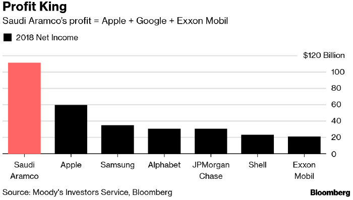 По результатам 2018 года Saudi Aramco возглавила рейтинг наиболее прибыльных компаний мира, легко обогнав таких «монстров», как Apple и Exxon Mobile. Более того, по данным Moody’s и Fitch, в прошлом году ближневосточный нефтяной гигант заработал столько же, сколько Apple, Google и Exxon Mobile вместе взятые.