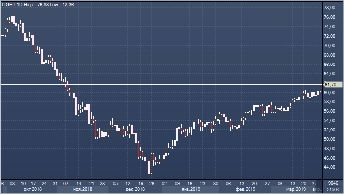 Цены на нефть в понедельник 1 апреля «без всяких шуток» обновили максимумы. Фьючерсы на WTI поднялись до $61.70 за баррель — самого высокого значения с 8 ноября 2018 года. Рост по сравнению с уровнями закрытия в пятницу 29 марта составил 2.46%. WTI с начала года подорожала на 35.67%.