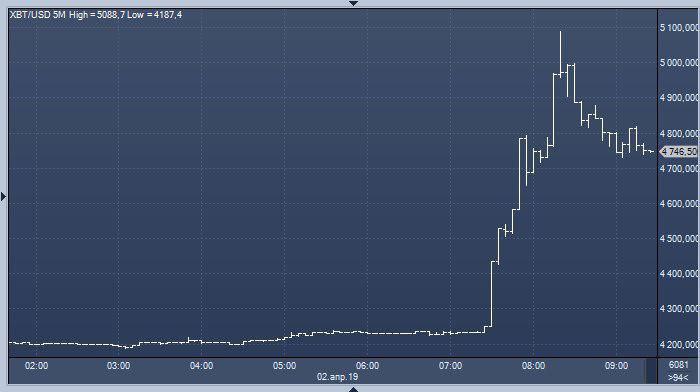 Криптовалютный рынок, долгое время мирно дремавший в узких диапазонах, неожиданно оживился и устремился вверх. Биткоин на короткое время пробил уровень $5000 отметившись на $5 078 впервые с ноября 2018 года. Первая криптовалюта подскочила в цене на 23% буквально в течение часа, а общая капитализация рынка цифровых активов достигла отметки $162 млрд.