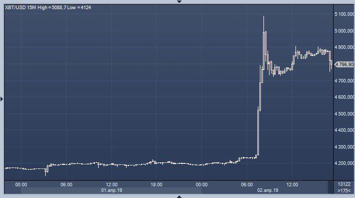 Курс биткоина на торгах во вторник 2 апреля неожиданно взлетел до максимумов с ноября. На момент публикации за последние 24 часа криптовалютный флагман подорожал на 15.3% до $4 782 за монету. При этом ранее в течение дня на люксембургской бирже Bitstamp BTC проверил на прочность психологическую отметку $5 000. Капитализация подскочила на $11 млрд до $84 млрд.