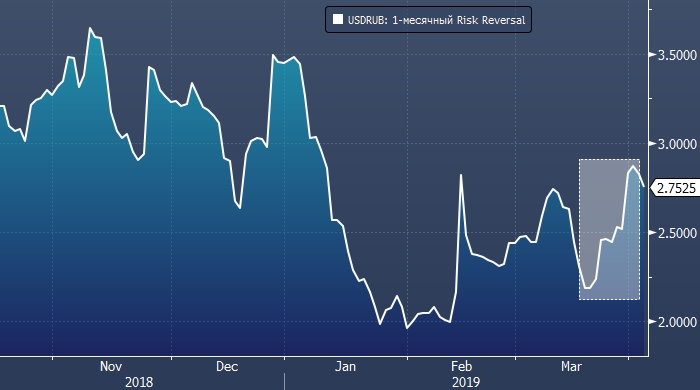 1-месячный индикатор Risk Reversal (ProFinance.ru: дельта подразумеваемой волатильности аналогичных 1-месячных call- и put-опционов) достиг максимальных с первой половины января уровней. Это говорит о том, что теперь рубль составил компанию турецкой лире и южноафриканскому рэнду, которые входят в число главных фаворитов медведей среди валют развивающихся стран.