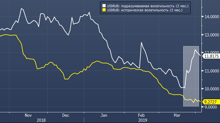 Подразумеваемая волатильность трехмесячных опционов на доллар/рубль резко выросла относительно исторической волатильности пары. Этот «индикатор страха», также известный как «вилка волатильности», говорит о серьезном росте опасений за среднесрочное будущее рубля среди инвесторов. Размеры этой «вилки» намекают, что инвесторы считают рубль второй наиболее рискованной валютой EM в мире после турецкой лиры.