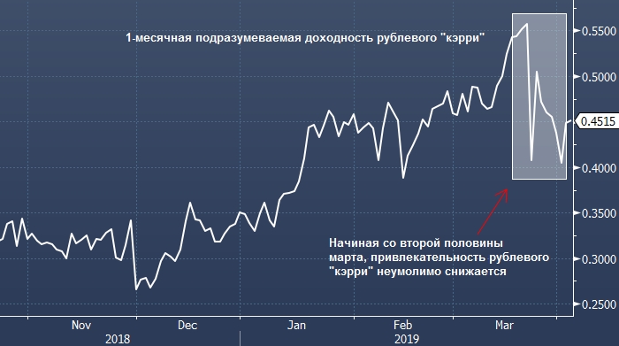 1-месячная подразумеваемая доходность рублевого «кэрри» с поправкой на волатильность и стоимость фондирования снижается с середины марта. Это говорит о том, что, по мнению инвесторов, покупка российской валюты больше не выглядит одной из наиболее привлекательных стратегий.