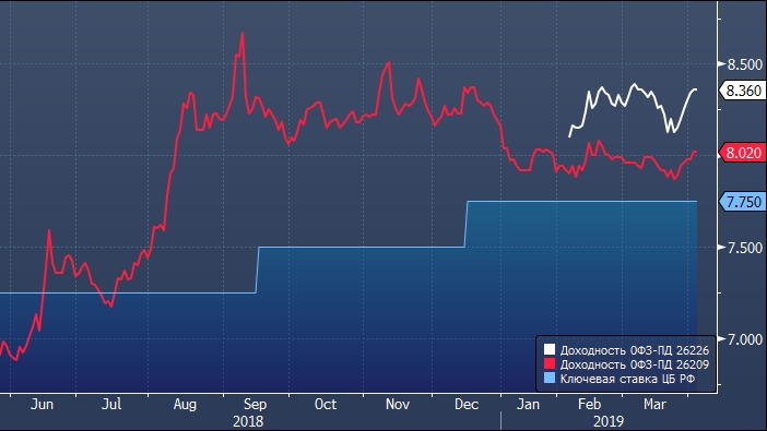 - ОФЗ-ПД 26209 с погашением 20/07/2022 на сумму в 34.97 млрд рублей при спросе в 64.41 млрд рублей и средневзвешенной доходности в 8.03%.