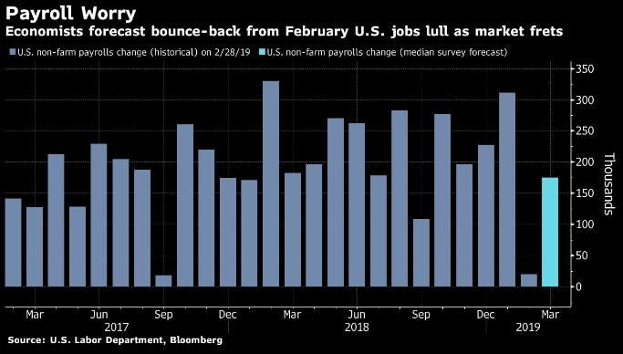 Год назад инвесторы были в восторге от признаков того, что рынок труда США перегревается. Теперь они готовы к обратному. Пятничный отчет о вакансиях, как ожидается, покажет восстановление нормальных темпов роста рабочих мест в марте вслед за самым слабым с 2017 года показателем февраля. Экономисты прогнозируют рост занятости на 175 000 человек. Это будет снижение по сравнению со средним показателем прошлого года, поскольку деловые инвестиции замедляются, а встречные ветра усиливаются. Инвесторы в облигации опасаются, что спад может быть более резким в этом году, так как рынки начинают готовиться к рецессии, а Федеральная резервная система заняла оборонительную позицию, снижая прогноз повышения процентных ставок.