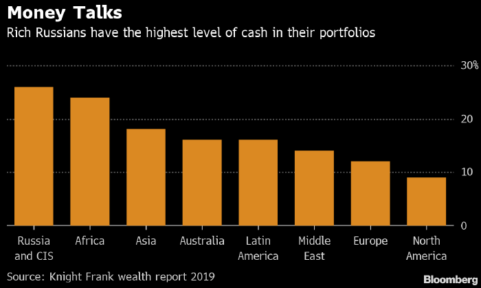 Многие российские богачи хранят средства на банковских депозитах, что частично объясняется опасениями замедления мировой экономики, пишет Bloomberg. В последние два года популярность этого инструмента заметно выросла после повышения ставок ФРС, и теперь доходность долларового депозита вполне может составить почти 3%. Популярность валютных вкладов объясняется и заметным снижением курса рубля в последние годы.