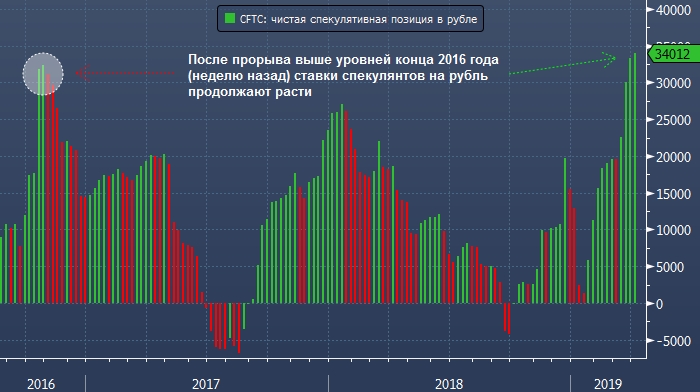 Спекулянты наращивали ставки на укрепление российской валюты на протяжении десяти из последних отчетных периодов. На неделе до 26 марта этот показатель взлетел до новых исторических максимумов и превысил предыдущий рекорд, поставленный в октябре 2016 года накануне победы Дональда Трампа на выборах президента США.