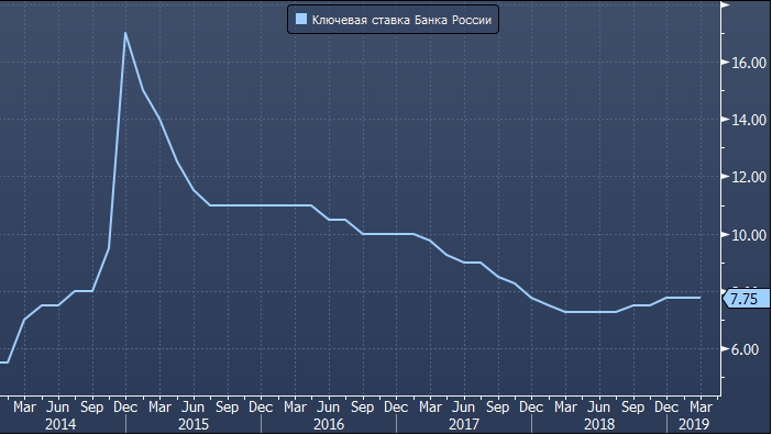 Стоит отметить, что медианный прогноз 16 опрошенных агентством Bloomberg экспертов предполагает в 4 квартале 2019 года снижение ключевой ставки Банка России с 7.75% до 7.50% годовых. При этом только Credit Agricole и IHS Global Insight прогнозируют повышение ключевой ставки в 3 квартале до 8%, а затем ее снижение на 0.5% (Credit Agricole) и на 0.25% (IHS) в последней четверти года. Остальные 14 респондентов уверены, что ЦБ РФ выше чем сейчас (7.75%) уже ставку в этом году не поднимет. Из 16 четыре эксперта на 4 квартал прогнозируют ключевую ставку на уровне 7.75% и 12 экспертов — на уровне 7.50% годовых.