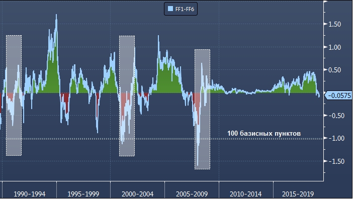 Дело в том, что ранее рынок фьючерсов на ставку по федеральным фондам перед рецессией закладывали в цены снижение ставки на 100 базисных пунктов в течение полугода.