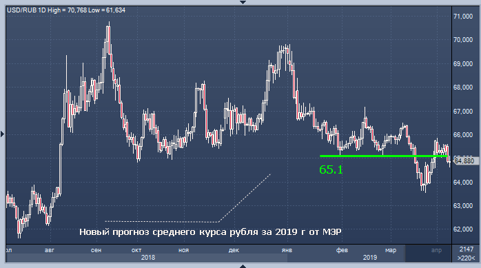 «Курс рубля к доллару США в первом квартале 2019 года сложился на уровне несколько слабее, чем предполагалось в прогнозе до 2024 года (66.2 руб./$1 фактически против ожидаемых 64.2 руб./$1). В течение года в пользу укрепления рубля будет играть возобновление притока средств иностранных инвесторов на рынок ОФЗ, слабая динамика импорта товаров и услуг на фоне жесткой денежно-кредитной и бюджетной политики, а также ослабление доллара США к евро. Ожидается сокращение оттока капитала по финансовому счету в два раза по сравнению с предыдущим годом. В то же время ослабление бюджетной и денежно-кредитной политики во втором полугодии текущего года, продолжение сверхнормативных интервенций Банка России на валютном рынке и ожидаемое снижение цен на нефть и другие товары российского экспорта станут ключевыми факторами ослабления курса рубля», — говорится в сценарных условиях.