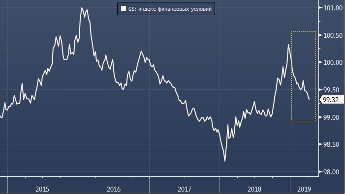 Индекс финансовых условий, рассчитываемый банком, рос большую часть 2018 года и достиг пика в декабре. Однако в течение 2019 года показатель демонстрирует снижение и сейчас практически вернулся к показателям середины прошлого года.