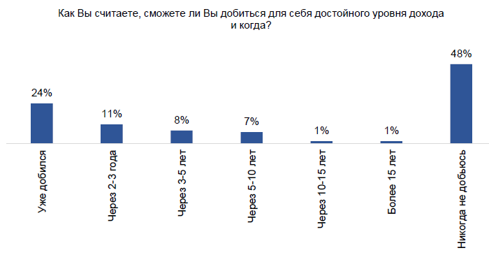 Своим доходом оказалась довольна четверть респондентов, каждый пятый планирует добиться достойной зарплаты в ближайшие пять лет, а чуть меньше половины участников опроса уверены, что не увидят ее никогда (ProFinance.ru: см. график в начале статьи).