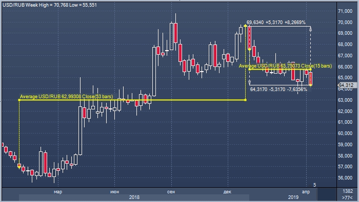 Средний курс рубля в 2019 году составит 65.50 за доллар. Такой прогноз на этой неделе озвучили аналитики Sberbank Investment Research. Отметим, что средний рыночный курс рубля по итогам 2018 года составил 63 за доллар. С начала 1 января 2019 г. среднее значение USDRUB составляет 65.75.