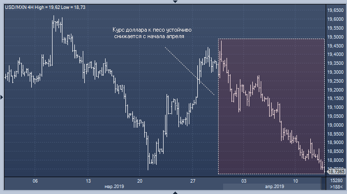 Другая высокодоходная валюта EM, мексиканский песо (ProFinance.ru: 28 марта 2019 года Банк Мексики сохранил ключевую ставку на уровне 8.25%, что на 0.50% выше ключевой ставки Банка России), напротив, продолжает пользоваться спросом, и спекулятивные ставки на его дальнейший рост взлетели на 9%, достигнув нового исторического рекорда. На неделе до 9 апреля курс мексиканского песо к доллару вырос на 1.5%, что стало лучшим результатом среди 24 валют развивающихся стран, динамику которых отслеживает Bloomberg.