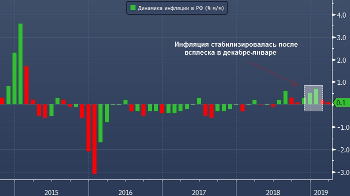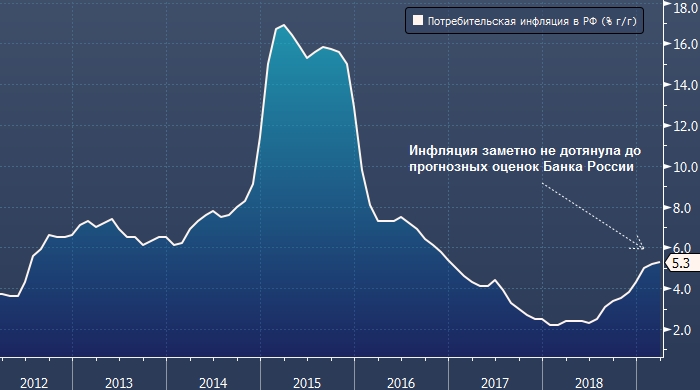 Увидев это, Банк России в прошлом месяце понизил прогноз по пиковым значениям инфляции до 5.5%. По словам Эльвиры Набиуллиной, ЦБ РФ может в дальнейшем скорректировать прогноз по инфляции на 2019 год, однако пока для этого нет предпосылок.