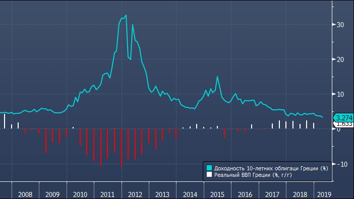 В 2011–2012 Греция оказалась в тяжелейшем финансовом положении, а вопрос о том, останется ли она в зоне евро, будоражил умы инвесторов. Однако прошло несколько лет, ситуация стабилизировалась, и несколько кварталов пусть сдержанной, но положительной динамики ВВП вернули популярность греческому долгу. В условиях, когда объем облигаций с отрицательной доходностью в мире превышает $10 трлн, доходность по 10-летним облигациям Греции выглядят весьма привлекательной, в результате чего сегодня она и достигла минимальной отметки с сентября 2005 года.