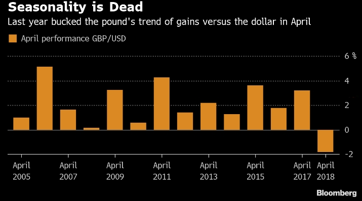Фунт может снова упустить некогда солидное сезонное апрельского ралли, обусловленное потоками дивидендов, и виноват в этом Brexit. Стерлинг рос по отношению к доллару каждый апрель на протяжении более десяти лет, прежде чем сломать эту тенденцию в прошлом году из-за негативного влияния Брексита и общего укрепления доллара. По мнению стратегов Mizuho Bank Ltd. и Royal Bank of Canada, такой модели, ранее считавшейся самой сильной сезонной тенденцией среди валют Группы 10 по версии Bank of America Merrill Lynch, будет недостаточно, чтобы перевесить риски Brexit в этом году.